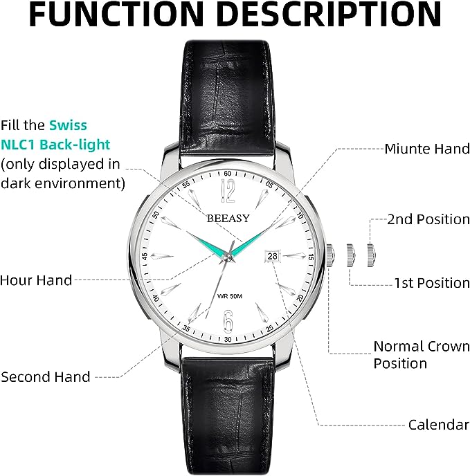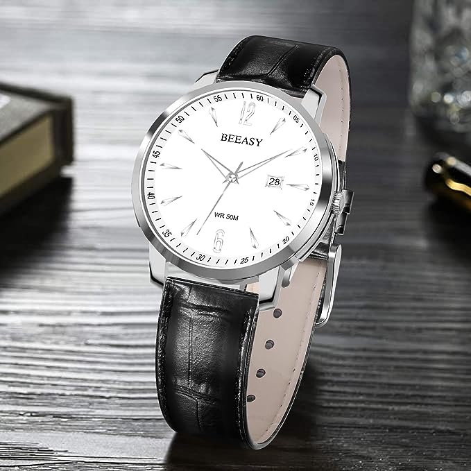 Men Casual Analog Quartz Watch with Calendar Sliver Stainless Steel Case,Waterproof Bussiness Watch with 42mm Black Leather Band,Chronograph Fashion Watch for Men-Black/White