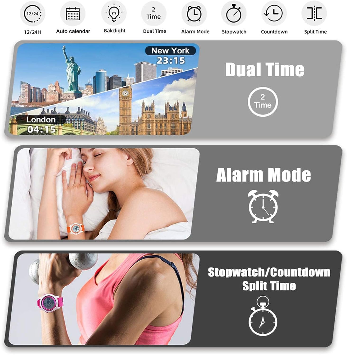- Mens Digital Watch: Dual time zone, 12/24 hours switch, automatic calendar, alarm clock, hourly alarm and daily alarm